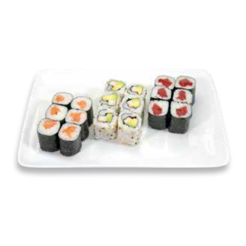 soupe et salade 18 maki neige : 6 saumon, 6 cheese, 6 avocat
